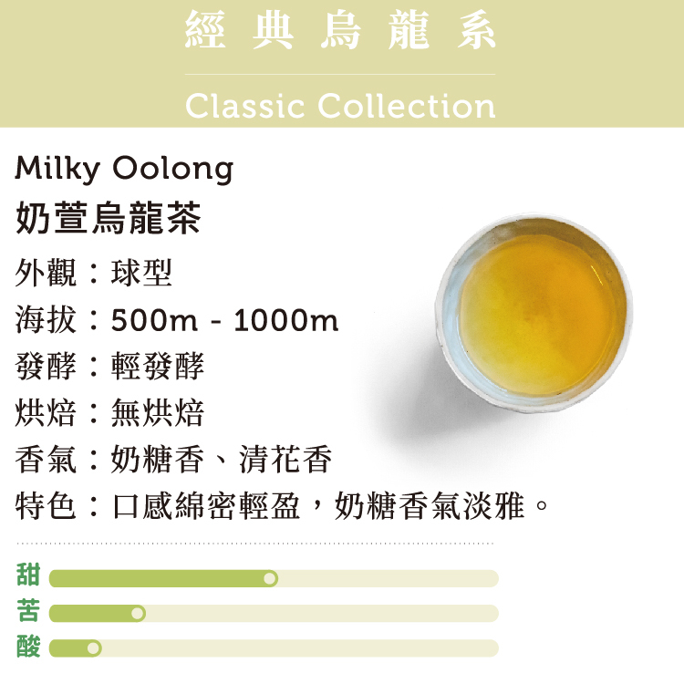 烏龍茶因為不同的品種以及製作方法,而有著不同的香氣與口感,經典烏龍系中,選擇了幾款風格獨特且在國際市場上較具代表性的特色烏龍茶,對於剛入門的消費者來說,能在這系列中嘗試不同的茶葉,尋找適合自己的特殊風味。